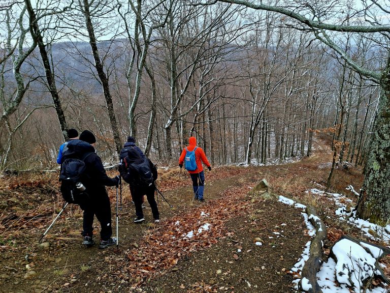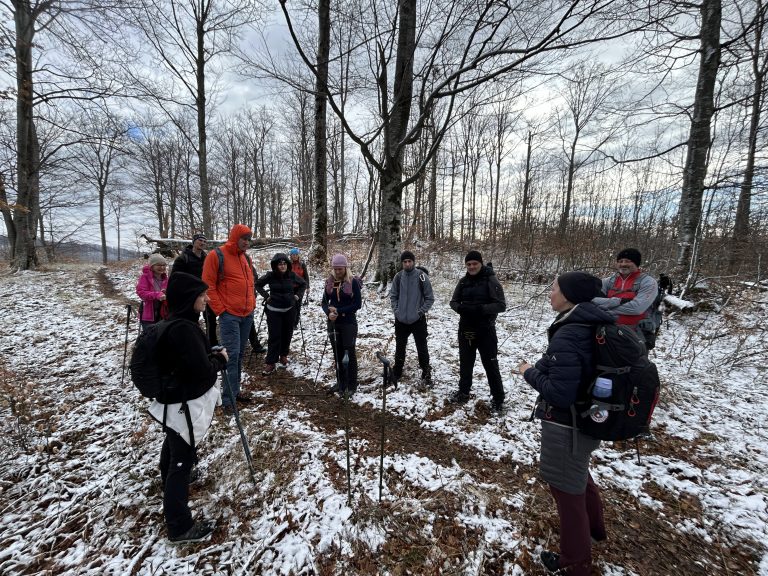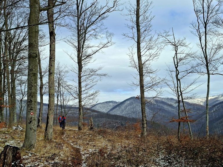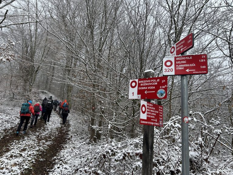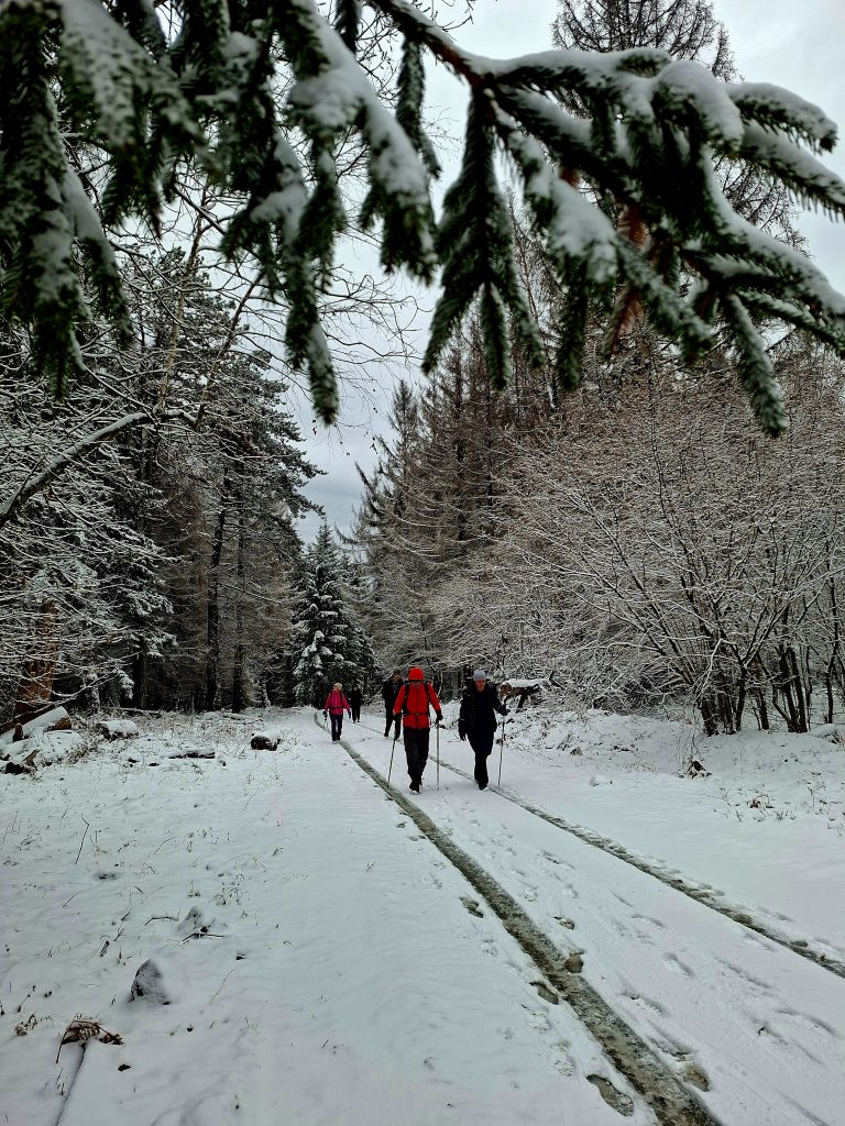 Kako smo nastavili hodati i svladavati sve veće nadmorske visine, zrak je postajao sve hladniji, a snježni pokrivač oko nas sve deblji. Krajolik se postupno mijenjao: među bjelogoričnom šumom i pokojom vitkom brezom počela su se pojavljivati crnogorična stabla, zaleđene lokvice vode i kristalići mraza na granama. Ubrzo je svaki naš korak počeo stvarati ono poznato zimsko škripanje snijega pod nogama, tihi znak da smo zaista zakoračili u snježnu tišinu. Snijega nije bilo mnogo, ali dovoljno da prizor dobije pravi zimski ugođaj.