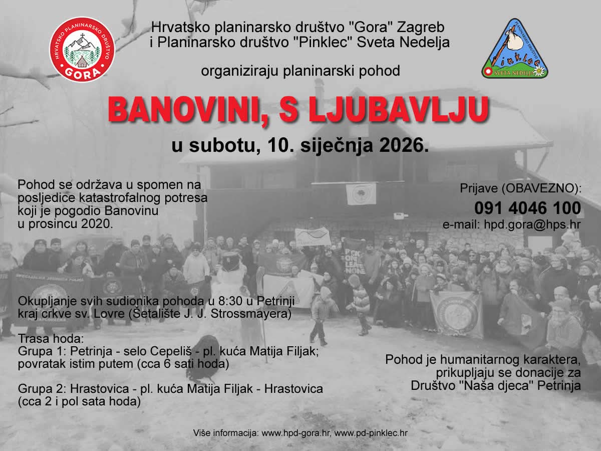 Prvi izlet u 2026. godini otvaramo sa pohodom “Banovini, s ljubavlju” koji je humanitarnog karaktera na kojem se prikupljaju donacije za društvo “Naša djeca” Petrinja.